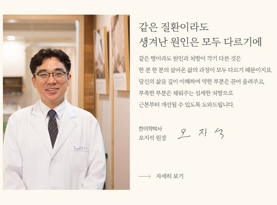 한약 처방에는 한의사의 치료 철학이 담겨있습니다. 같은 병증일지라도 다른 시선으로 질병을 바라보면 처방은 달라집니다. 이러한 오지석 원장의 한약 치료에 대한 신념과 철학을 컨텐츠에 담았습니다. ‘정확한 처방으로 내 몸에 딱 맞는 한약을 처방한다’는 차별점을 강조하였습니다.